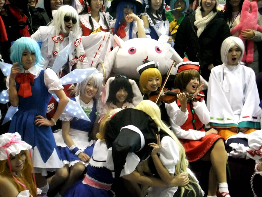 虽然千人⑨舞开始时已经是临近展会闭幕的时间,摊主们也都把摊位收拾得差不多了,大部分游客已经离去,大家也都体力消耗很大(我的手被手提袋勒得很疼,已经7个小时没吃没喝,胳膊因一直举高相机拍摄而酸疼)。然而仍然有一批人留了下来,要么上阵跳舞,要么摄影。那时我有一种强烈的感觉,此时留下来的,都是通过某种意义上的“考验”后的对动漫有着执着热爱的人们,能感受到一股潜在的凝聚力,这使我精神又抖擞起来。