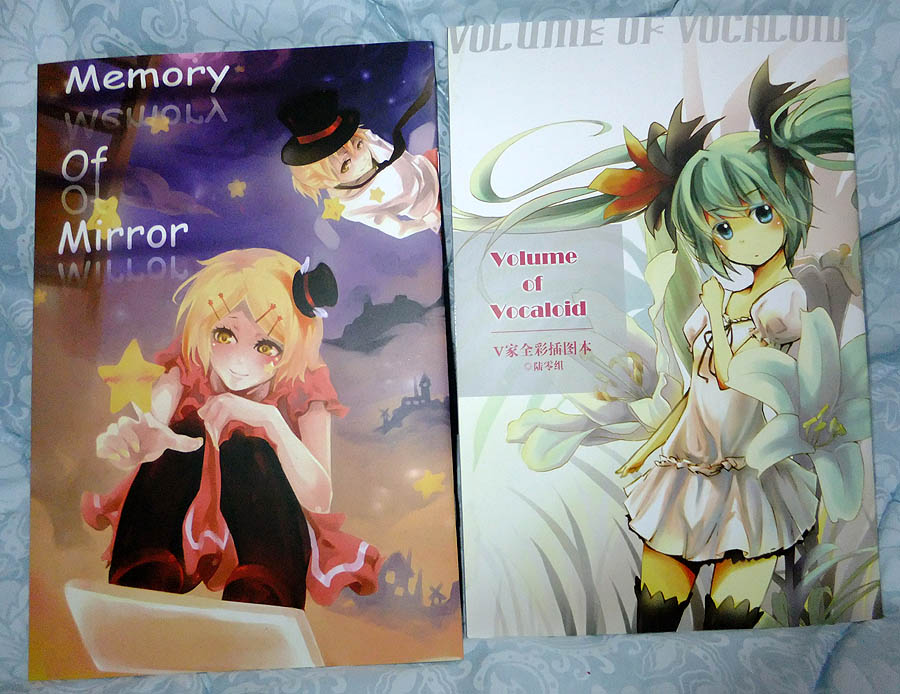 因为摊主销售的Volume of vocaloid本子都被水浸过了,有些皱,而摊主很有良心,不好意思原价销售,于是凡是购买Memory of mirror就白送了这个本子。摊主真是好人,专门给我挑了本几乎看不出水浸过的Volume of vocal
