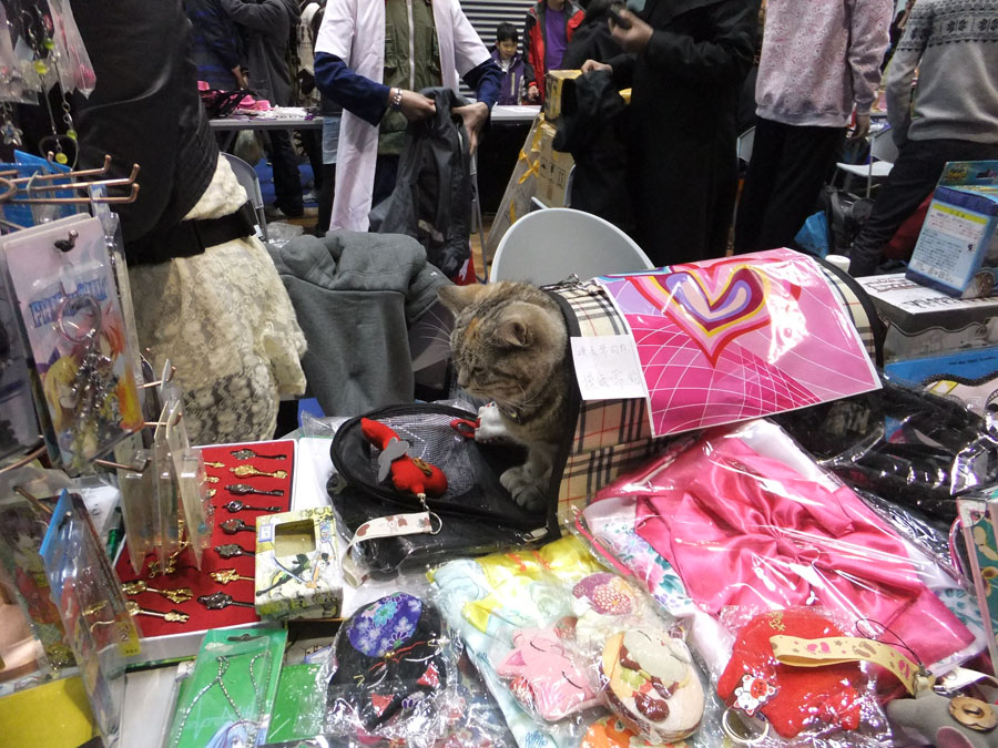 此漫展卖的东西属于大杂烩类,几乎没什么本子卖。倒是看到有两三个摊位有卖哲♂学相关物品的,算是难得一见,而且也第一次亲眼见到了比利的手办,不过,和以前照片上看到的一样,并不好看。另外就是有Acfun的专门摊位,卖Acfun的U盘、T恤、海报、鼠标垫等物(偏贵)。另外,管内还有卖烤肠的,还有小型女仆餐厅。