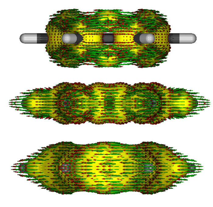 可见,sigma电子并没有整体离域,而是在局部空间有较大的定域性。在C-C成键区域和H原子附近,感应电流密度矢量产生了局部的环流。图中左上和右下出现了两个很长的箭头超出作图范围,那是程序bug,不用管它。想去掉的话可以利用-maxarrow参数。