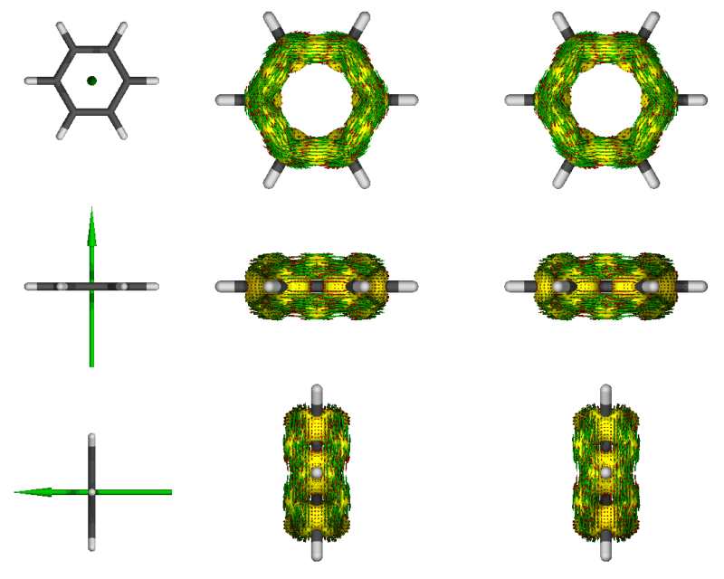 绘制单个视角的图像时并不会显示磁场矢量箭头。但是对照前面多视角的图可以知道此图中磁场方向是从屏幕里面指向屏幕外面的。可清楚地看到感应电流方向都是满足左手规则,展现了苯的pi电子的芳香性。