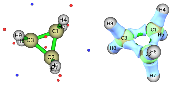 这里再来看两个例子。下图左边是环丙烷的结构和分子表面静电势极值点,右边是Multiwfn的主功能5计算的它的电子密度拉普拉斯函数0.35等值面图,蓝色为负值(电子聚集区域)。