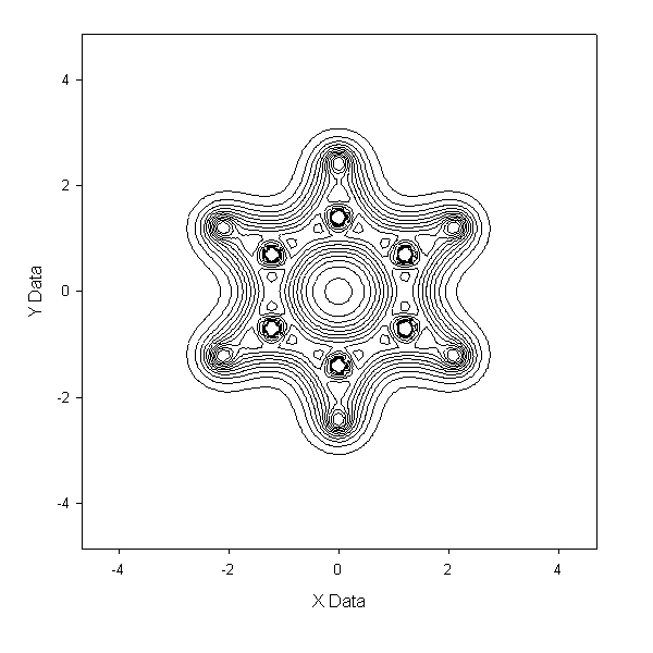 得 到output.txt,和例1一样。由于格点文件数据是离散的,故这里面的数据点只包含.cub中的Z值最接近于0的那个平面中的数据点。然后可以放到 sigmaplot等软件做图。以苯分子为例子(压缩包内c6h6.fch),以此法作图得到benzene-density.PNG及benzene- density-contour.GIF