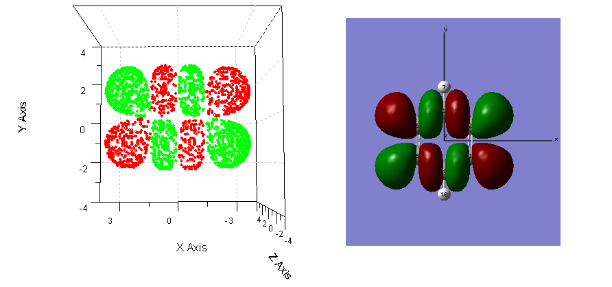 现在我们将这些格点放到origin里面做三维散点图,正值与负值部分分别用红色和绿色表示,得到了isosurface.PNG文件的左图。可以看到,我们提取的等值面上的格点是正确的,形状与gaussview中显示的此分子轨道波函数的0.02的等值面完全一致。