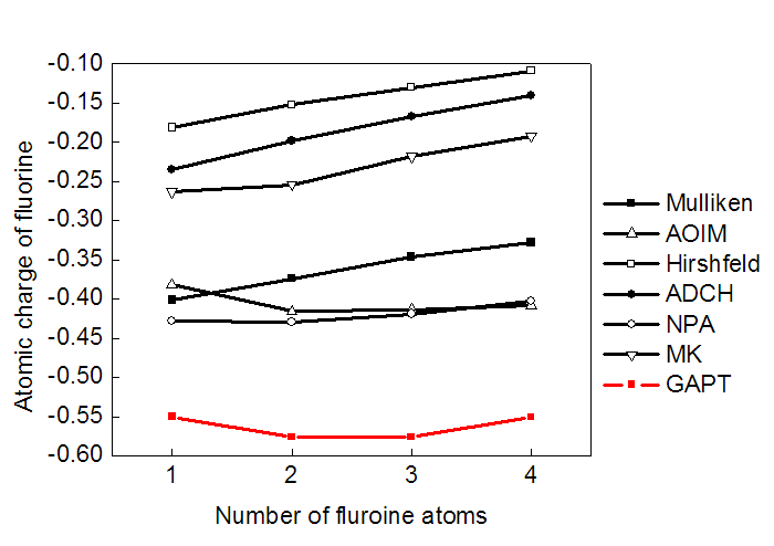 下图显示了CH4的氢被不同数目F取代后每个氟原子的电荷变化。碳就那么多给电子的能力,氟越多,每个氟分到的电子就越少,因此氟取代数目越多时理应每个氟的电荷绝对值变得越小。可见大部分计算原子电荷的方法都反映了这个趋势,即曲线整体斜向上。但是GAPT却完全没有反映出这一点。