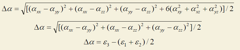 极化率张量是个对称的3*3矩阵,故所以只有6个独立的矩阵元列了出来。每个体系的极化率的大小一般只用一个数值<α>来表示,也就是上面给出各向同性平均极化率,它是对XX、YY、ZZ取平均得到的。极化率也经常通过极化率体积来表示,上面也给出了。极化率并不是各向同性的,体系对不同方向射来的电场的响应是不同的。如上可见,Multiwfn也输出了极化率的各向异性值Δα,数值越大各向异性越强,球对称体系显然其值为0。各向异性可以以三种方式定义,分别如下所示,详见Multiwfn手册3.27.1节