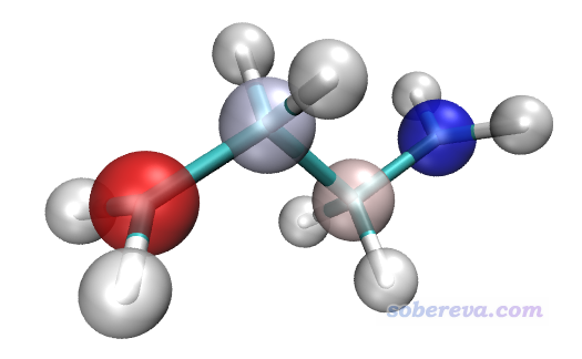 从上图中看不出各个原子是什么元素,如果通过颜色又想体现出元素,又想展现出原子属性值,那么可以用两个Rep。我们把目前已经有个一个Rep删掉,即点击Delete Rep按钮,然后点Create Rep建立一个新Rep,用Charge着色,用VDW风格显示,材质设Transparent,Sphere Scale设0.3,色彩范围还用-0.2~0.2。然后再点击Create Rep,用Name着色,用Licorice风格显示,材质用Opaque。然后进入Graphics-Material,把Transparent的Opacity设0.7降低其透明度。此时用自带的Tachyon渲染器渲染出的图如下