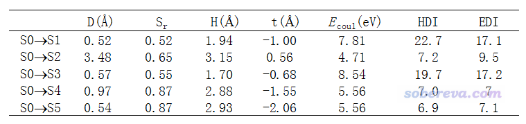 另外,别去苛求定义个诸如“D大于xxx就证明是电荷转移激发”这种判断标准,一刀切是使不得的。应该算作哪种激发,应当将各种指数还有空穴、电子分布图结合起来分析判断。另外,有的电子激发本身就是诸如CT和LE激发高度混合的模式,非要搞个严格标准来划分成要么CT要么LE一点意思也没有,也很有误导性。