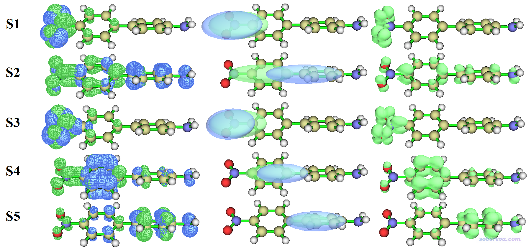 上图的S0->S2和S0->S3一看空穴&电子等值面图就知道肯定是个里德堡激发,因为图上显示电子分布范围非常大,已经显著出现在了分子外围区域,且远远超过空穴的分布范围。这点也直接体现在电子的σ非常大,是空穴的σ的近三倍。从Sr上也体现出,由于空穴和电子的分布范围差异较大,Sr的数值比较小,显著小于S0->S1和S0->S6这样普通价层激发的情况。注意,上图中显示里德堡激发的空穴&电子图用的等值面数值很小,只有0.00005,这是因为这类激发的电子分布非常弥散,摊得非常开,如果等值面数值不这么小的话,就看不到电子对应的很弥散的等值面(可能有人觉得,对于价层激发,等值面数值用这么小的话电子的等值面照样也会很弥散,与里德堡激发不容易区分开。但别忘了,对于普通价层激发,当你把等值面数值设得很小的时候,空穴的等值面也会同时变得非常弥散,而里德堡激发的电子的等值面弥散程度总会远高于空穴的)。这俩里德堡激发的D指数不大,这从等值面图上也可以大致看出,确实空穴和电子的质心位置相差不是很大。本例体现出前面提到的里德堡激发应具备的特征是:D和S都不大,而电子的σ指数远大于空穴的。