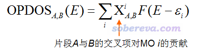 重叠布居DOS(Overlap population DOS,OPDOS)对于考察片段间的相互作用比较有用。笔者在《Multiwfn支持的分析化学键的方法一览》(//www.umsyar.com/471)里专门介绍过什么叫Mulliken键级,这和重叠布居(Overlap population)是一码事,可以体现原子间是成键作用还是反键作用,没看过此文的话一定要仔细看一下。文中还提到,重叠布居可以精确分解为各个轨道的贡献,将这个思想和DOS图搞到一起,就是OPDOS的定义了。下式是片段A与B之间的OPDOS的表达式