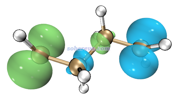 在《谈谈自旋密度、自旋布居以及在Multiwfn中的绘制和计算》(//www.umsyar.com/353)一文中笔者举了丁烷双自由基的例子。我们用Multiwfn的主功能5计算完这个体系的自旋密度格点数据后,在后处理菜单选择导出cube文件,当前目录下就得到了spindensity.cub。将此文件挪到VMD目录下,启动VMD,直接输入cub spindensity 0.01,马上看到下图,绿色和蓝色分别对应自旋密度为正和为负的部分。