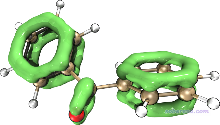 在《在Multiwfn中单独考察pi电子结构特征》(//www.umsyar.com/432)一文中介绍了怎么通过Multiwfn非常简单地绘制出平面和非平面体系的描述pi电子结构的函数的图像,其中对一个非平面体系苯甲酮绘制了LOL-pi等值面图。使用本文的脚本,直接用cub命令将LOL-pi的格点数据文件载入VMD,等值面设为0.5后,通过VMDrender_full.bat渲染直接就得到了下面这个效果非常理想的图像。
