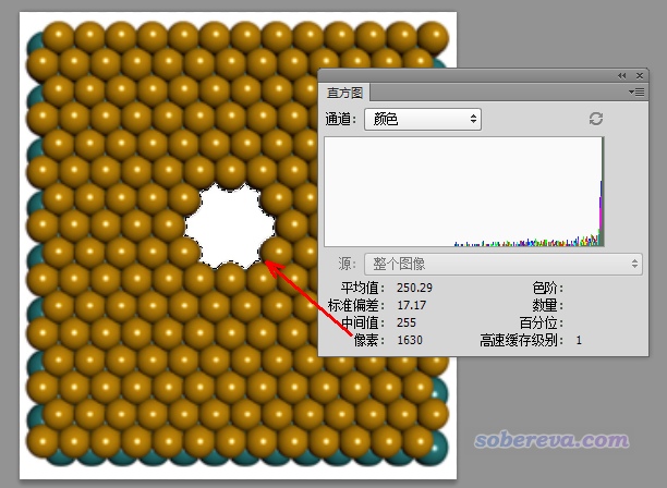 把图片载入ps,用魔棒工具选择那块白色区域,再点击“窗口”-“直方图”,就看到了选区的像素数为1630。