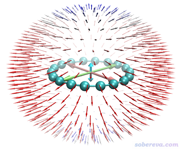 此图和球面表示法原文J. Comput. Chem., 32, 1128 (2011)里的图2(e)几乎完全一样,而且比原文的效果更好,因为原文中的箭头分布并不均匀。图中箭头的颜色按照蓝-白-红变化,箭头越短越蓝,越长越红,箭头实际长度对应于的βeff(θ,φ)矢量的模乘上自设的比例因子。