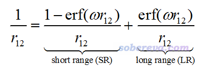 对GGA泛函做长程校正(long range correction, LC)的思想最早由Tsuneda等人于JCP, 115, 3540 (2001)提出,它将描述电子间相互作用的1/r12算符做如下划分,其中w直接影响被归属于长程和短程作用的范围。erf是误差函数(error function),介绍见https://en.wikipedia.org/wiki/Error_function。随着自变量从0开始增加,erf也从0开始逐渐趋于1。