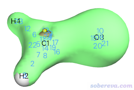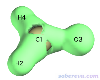 图中的等值面把电子密度拉普拉斯函数明显为负的区域展现出来了。这个函数为负的区域体现的是价层电子密度凝聚的区域。由图可见在碳的上方有一块空缺,实际上这个区域电子密度拉普拉斯函数为正,体现出电子在这个地方是发散的,显然容易被亲核进攻。
