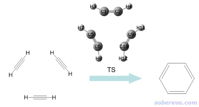 本例的分析对象是乙炔三聚化成苯分子的过渡态结构,这个反应示意图如下所示。笔者之前有个博文曾以这个反应为例考察反应过程的电子结构变化,建议看看:《通过键级曲线和ELF/LOL/RDG等值面动画研究化学反应过程》(//www.umsyar.com/200)。