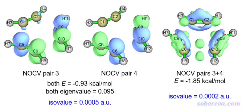 从NOCV pair 1和2各自的密度等值面上看不出明确的化学意义,但是二者的加和对应的轨道相互作用意义很明确,可见在三个即将形成的C-C键之间都有一块绿色等值面,因此体现的是相邻乙炔间的C-C键的sigma作用。这两个NOCV pair的能量总和-51.0 kcal/mol已经不小了,这说明在过渡态结构下三个已变形且靠近的乙炔之间的sigma轨道相互作用已经很明显了。此例也反映出,当一些NOCV pair存在简并性,而且单独看的时候不好指认作用特征时,应当将它们加和之后再考察。还值得注意的是,上图中蓝色等值面在平面内pi作用区域,这体现出在电子凝聚于C-C间形成新的sigma键的时候是以乙炔原有pi键上的电子减少为代价的。