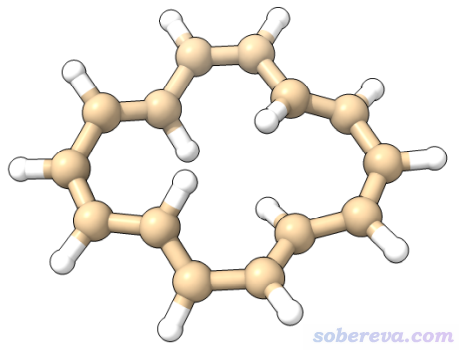 轮烯是一类环状烃类体系,当碳数n为偶数时通式是CnHn。根据n的不同,由于位阻效应和芳香性的差异,轮烯有的是纯平的有的是扭曲的。Multiwfn程序包的examples目录下的[14]annulene.xyz是ωB97XD/def2-TZVP级别优化的[14]annulene轮烯分子结构,如下所示,可见整体有一定平面性但又不是完全平面。此例我们就用上文介绍的方法定量考察它的平面性