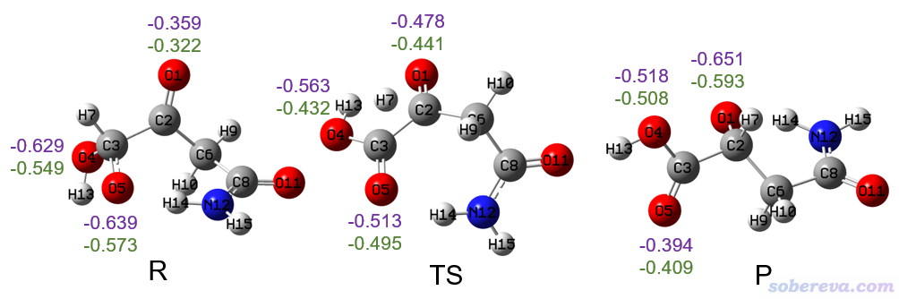 再强调一下,前面那些Lewis图描述的电子结构很多都是极不确切的。尤其是分子内氢负离子转移,其实只能算得上是“Lewis式变化角度上的氢负离子转移”。如果脱离了Lewis式,从严格的 角度看待,其实说是氢负离子转移是极度牵强的。比如上图第一个反应式,其反应物(R)、过渡态、产物(P)的结构图如下,几个氧原子以及转移的H的Mulliken和ADCH原子电荷分别用紫字和绿字标注了