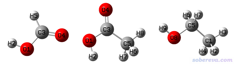 作为例子,下面对甲酸、乙酸、乙醇体系的几个氢来计算原子核处的静电势,结构如下