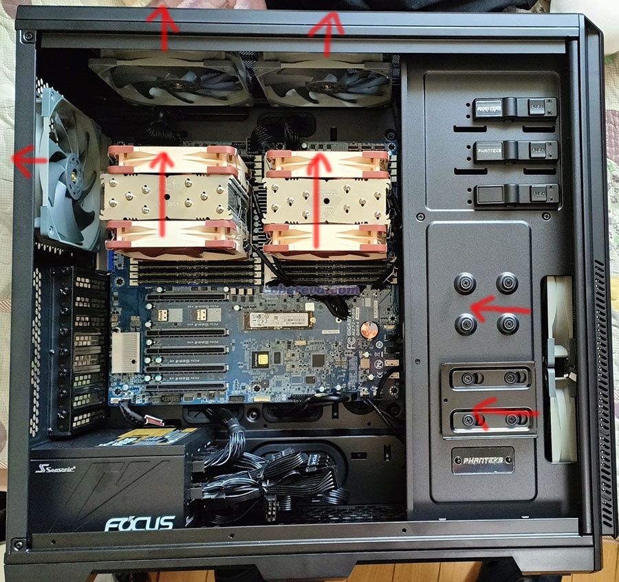 我认为像这样从下向上走风比起从前往后走风好得多,此时两个CPU的温度是基本一致的,不像从前往后走风会导致后面那个CPU温度比前面的明显更高。而且热风从上面出,满载运算时在冬天可以把手放在机箱上方暖手(亲测有效)。不过机箱上面就不能放东西了。