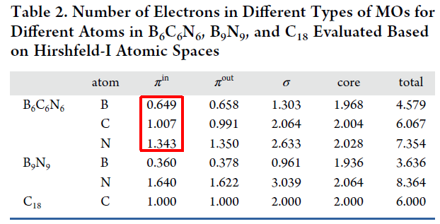 如上可见,B、C、N原子的π-in电子数分别是0.649、1.007、1.343,和如下所示的Inorg. Chem., 62, 19986 (2023)中的表2中的数据完全一致。