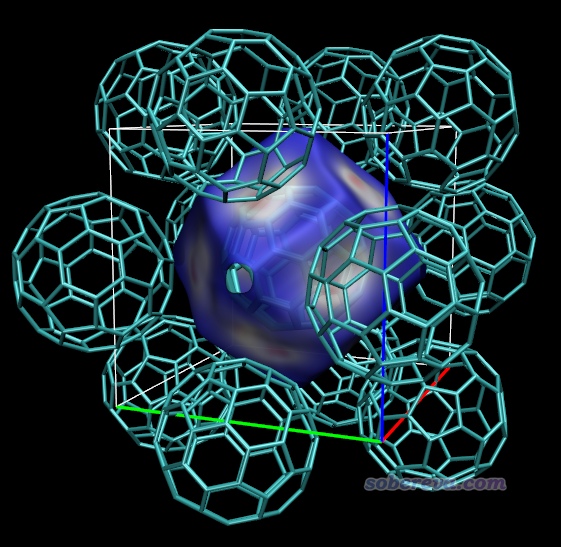 本文文件包里的C60.cif是C60富勒烯晶体结构文件。按照3.0和3.1节的做法抠团簇、绘制电子密度着色的Hirshfeld surface,会得到下图。这里我在Graphics - Representation里选择显示等值面的那个Rep后在界面右下角Show旁边的下拉框里选择了Box+Isosurface,这样除了等值面外,盒子范围还会用细线同时显示出来。由下图可见,等值面上有个难看的窟窿,因为6个富勒烯之间有孔洞区域,Hirshfeld surface实际上会延伸到这里,但当前被尺寸有限的盒子截断了。