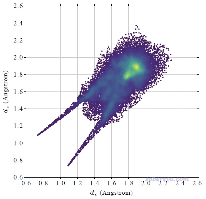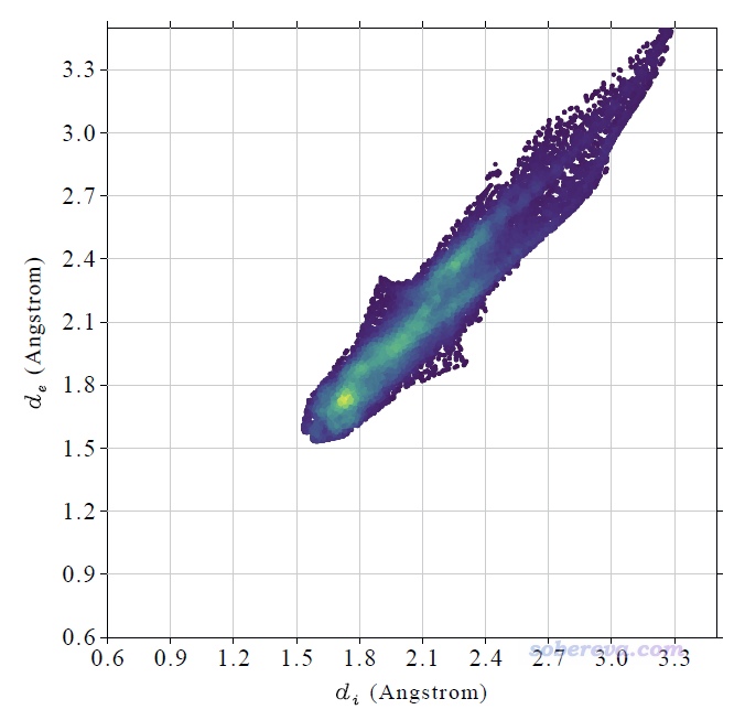 顺带一提,此体系的指纹图如下所示。绘图前用Multiwfn菜单里的选项3 Set range of axes适当加大了上限。可见散点的分布区域很窄,各处d_i和d_e数值都差不多大,涵盖从中等到较大范围。这体现出表面顶点基本都是位于中间分子和周围分子之间的正中央区域,并且中间分子和周围分子有的地方挨得近(d_i和d_e为中等大小),有的地方离得远(d_i和d_e较大)