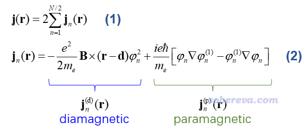 由上式可见,轨道的感生电流由paramagnetic(顺磁)和diamagnetic(抗磁)两部分构成,以下分别简称para和dia。dia电流是楞次定律说的给导体施加外磁场时产生的那种感生电流,正比于轨道上的电子的概率密度,它产生的感生磁场会在环形感生电流内部区域对外磁场产生削弱作用。而para部分完全来自于量子力学效应,直接牵扯到轨道波函数,方向与dia相反。