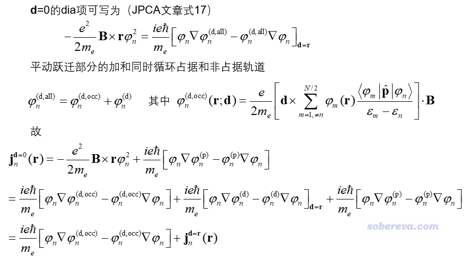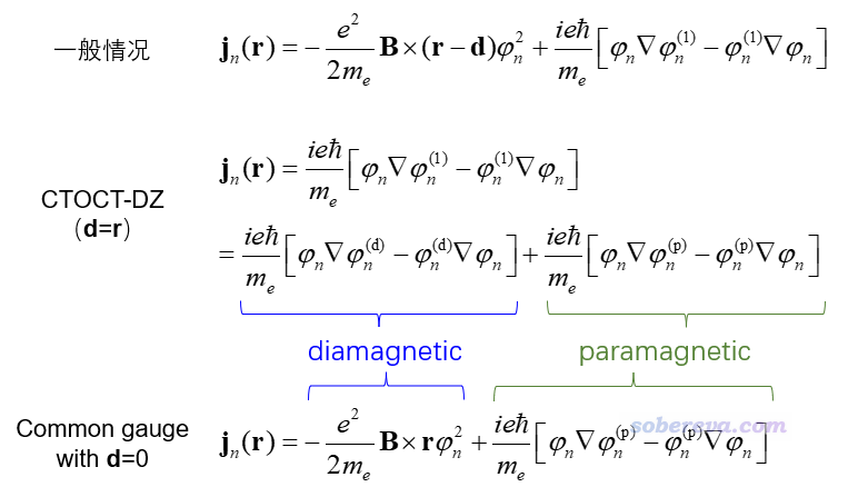 CTOCT-DZ方法由于d=r,所以上面“一般情况”中的B×(d-r)项就没了,再把φ(1)=φ(p)+φ(d)代进去就得到了CTOCT-DZ的表达式。可见其中一部分由涉及平动跃迁的φ(d)所贡献,这部分被习俗地视为CTOCT-DZ的dia项,另一部分由涉及转动跃迁的φ(p)所贡献,这部分被习俗地视为CTOCT-DZ的para项。而对应d=0的common gauge-origin的情况中φ(d)就不复存在了,φ(1)=φ(p),就有了上面的式子。由上式可见,CTOCT-DZ和d=0的情况的para项是相同的,但是dia项不同,因此两种情况计算的轨道感生电流是不同的。