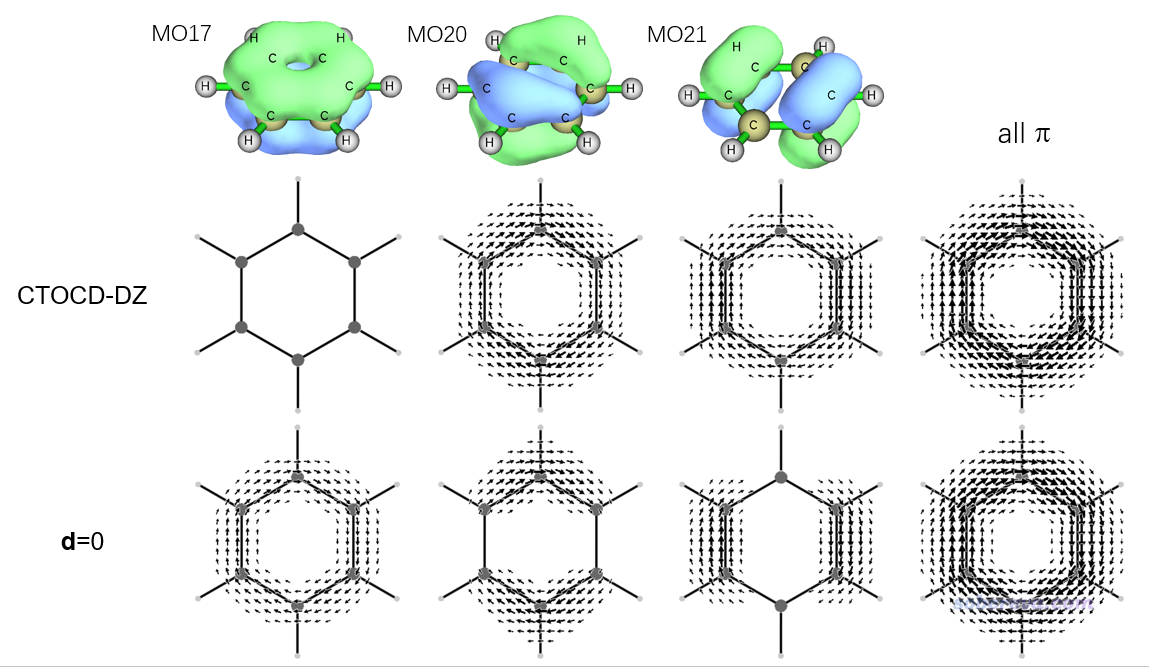 那么是否轨道的感生电流一定不能用于讨论轨道对芳香性的贡献呢?在我来看,这种讨论方式虽然由于上述原因而非常不推荐,但在特殊情况下还是可行的,比如上面d=0方法算的MO 17的感生电流确实体现出MO 17对芳香性有明显贡献。这里我阐述我的个人观点:如果一个轨道对电子在某个环上的多中心离域完全没有贡献,那么无论怎么选择d也算不出它有连贯环绕整个环的dia电流,例如内核电子轨道;而如果能有特定的d可以算出来它有连贯环绕整个环的dia电流,那么这个轨道对多中心离域就是有明显贡献的,如苯的MO 17。从前面的图中还可以看到,d=0时的MO 20和21各自的感生电流都没有在整个苯环上连成整体,但在CTOCD-DZ的情况下则连成了整体,根据以上我的观点,这直接说明了这俩轨道确实对pi电子的六中心离域有直接贡献。