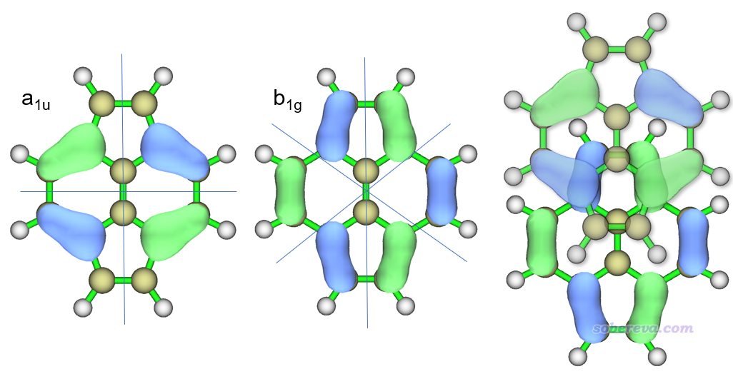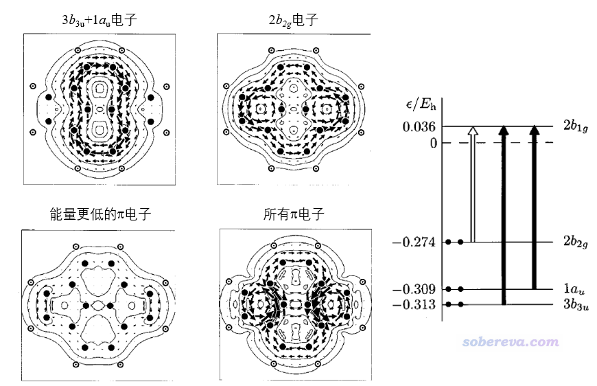 下图是CTOCD-DZ计算的pyracylene的感生电流以及轨道跃迁示意图,分子在YZ平面上,外磁场由屏幕内向着屏幕外顺着X方向加(图片取自前述JPCA文章,为了和我的习俗相同,我把文中的感生电流方向反转了一下,顺时针和逆时针分别对应dia和para电流)。下图右侧示意图中实箭头对应允许的平动跃迁(因为b3u与b1g的直积b2u包含y,au与b1g的直积b1u包含z),故b3u和au轨道贡献顺时针的dia电流;空心箭头对应允许的转动跃迁(因为b2g与b1g的直积b3g包含Rx),故b2g轨道贡献逆时针的para电流。由于更低阶pi轨道对感生电流贡献甚微,所以总的pi感生电流的图像特征基本等于b3u和au贡献的dia电流以及b2g轨道贡献的para电流的总和。由于同时有4个电子贡献dia电流而只有2个电子贡献para电流,故前者整体强度更大,这是为什么在这两种电流方向相反的分子的上、下区域,总电流体现的是顺时针特征。