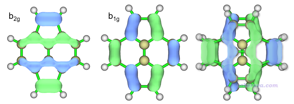 如果不通过群论知识,怎么判断什么样的轨道之间的转动跃迁是比较显著的呢?这可以结合图形进行判断和理解。若绕着磁场旋转一个轨道后就可以令二者不再正交,那么它们之间的转动跃迁就是允许的,这通常出现在两个轨道的节面数目是相似的情况下。例如下图所示的pyracylene的HOMO (b2g)→LUMO (b1g)的跃迁就是如此,最右边的图是把HOMO旋转90度后和LUMO的重叠图,可见相位完全匹配且高度重叠,因此这种跃迁能够对para电流有显著贡献。