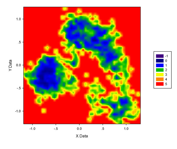 为何要让ddtpd输出P=0的点需要说明一下,尽管这些点看似没有意义。sigmaplot会对输入的数据点的空隙进行差值使图像平滑。如果P=0的区域都不输出,这么大范围的数据空缺区域sigmaplot都会通过插值来弥补。但由于空缺区域往往过大,插值出的结果经常很糟糕。下图是75*75格点,不含P=0的点时sigmaplot给出的结果,和前面的图相对比,会发现在数据点集中分布的区域周围多出了一些的东西(如图的左下角),尤其是在图的中心偏左下的位置多出现一块深蓝区域,如果将它解释为自由能很低的区域就明显错了,这都是因为sigmaplot插值所致。