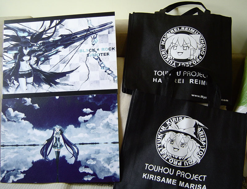 油库里的布袋子,设计和质量挺不错,而且价格很便宜,就买了两个,袋子一面是红白一面是黑白。两个板画很大,中间是半厘米厚的大抵是PVC的材料,表面覆上一层图案。BRS和miku的构图都很好,用在这种大板画上颇有气势。这东西又大材料不硬,容易出现压痕,摊主又不送袋子,想完美地拿回去不容易。好在我决策正确,将两个板画图案部分朝里叠放在一起,回去后发现与手接触的背面边缘已经有些褶皱了,而正面安然无恙。
