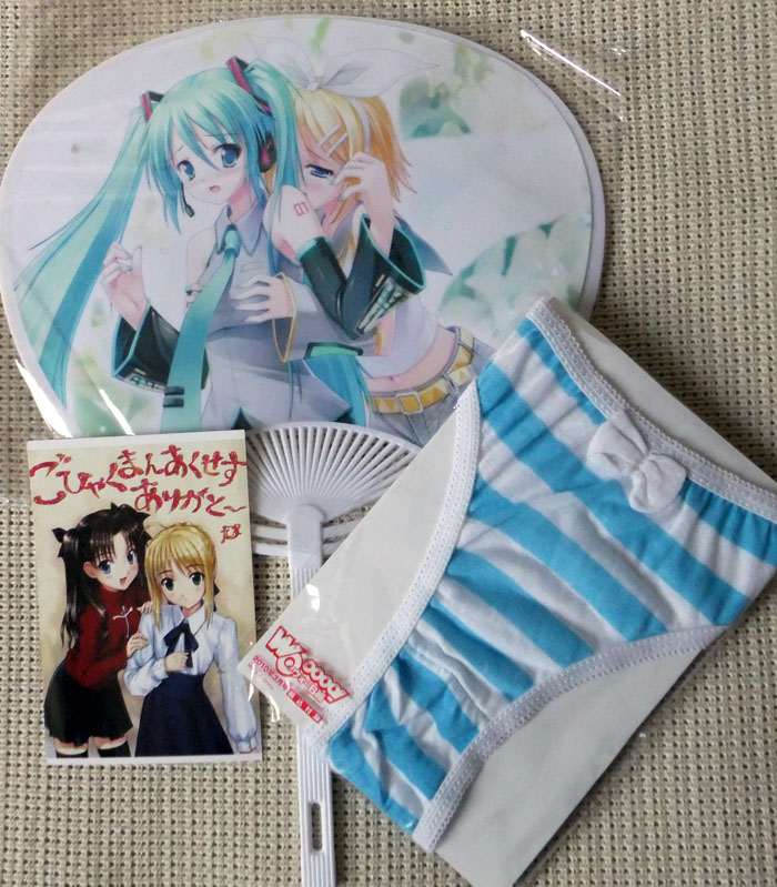 在这个小展会买了三样东西。MIO的胖次一直很想要,我以前就有觉得肯定有展会会卖这个,果不其然这次碰着了,我也大庭广众之下光荣地将之套在了头上,就像下图的小焰(当时忘了还有黑子这种戴法),卖胖次的摊主也这么套在头上。以前泥轰有过买杂志附送胖次的著名事件,这个似乎就是那次的尾货。