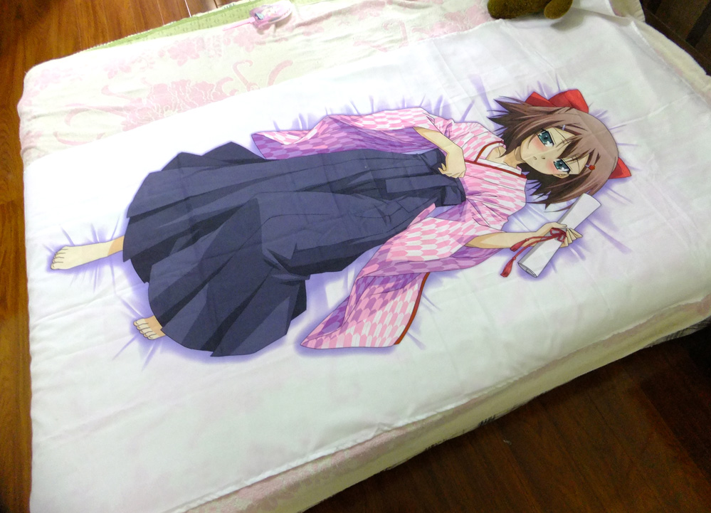 这个日本原单的秀吉的等身丝床单是这次的最大收获。去年Mycomic的时候就见到了这样的床单,当时卖100,太黑,虽然十分喜欢,还是没舍得买。虽然网上也有卖,但是不亲自检查不放心。这次再次见到,卖40,是很公道的价格,毅然出手。我可是相当喜爱秀吉,尤其这床单上的表情,爆萌啊!秀吉俺の嫁!看着铺在床上欲迎还羞的秀吉,我心里不禁闪出一句话:“你就从了我吧!”。可惜《笨蛋测验召唤兽》里面秀吉终究还是配角,应该单独出几个以秀吉为主角的OVA以飨观众。我在会场展开床单检查有无瑕疵时,旁边经过一人对朋友说床单上这角色是男的,其朋友似乎还挺吃惊。YY归YY,我还是绝对舍不得真的把这个当床单睡在上面的。床单表面有些折痕,有空的时候放水里浸一下再平铺晾干估计就平了。