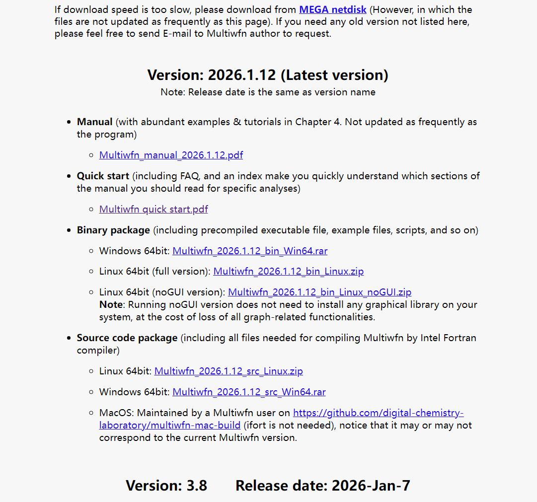 为了在未来令Multiwfn既便于频繁更新同时也便于用户区分版本、免得需要提及开发版的更新日期,未来Multiwfn的版本不再采用频繁更新的开发版累积到一定程度后发布正式版的形式,而是以更新日期直接命名。例如Multiwfn在2026年1月12日发布的版本(目前已发布)直接就叫Multiwfn 2026.1.12,对应的Windows版可执行程序压缩包名字为Multiwfn_2026.1.12_bin_Win64.rar,解压后得到的目录为Multiwfn_2026.1.12_bin_Win64,因而直接根据压缩包名和目录名就可以区分具体版本。